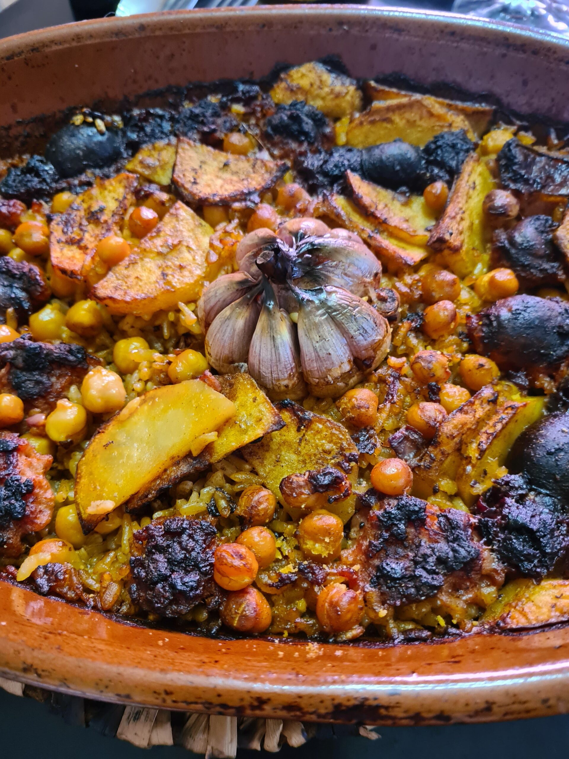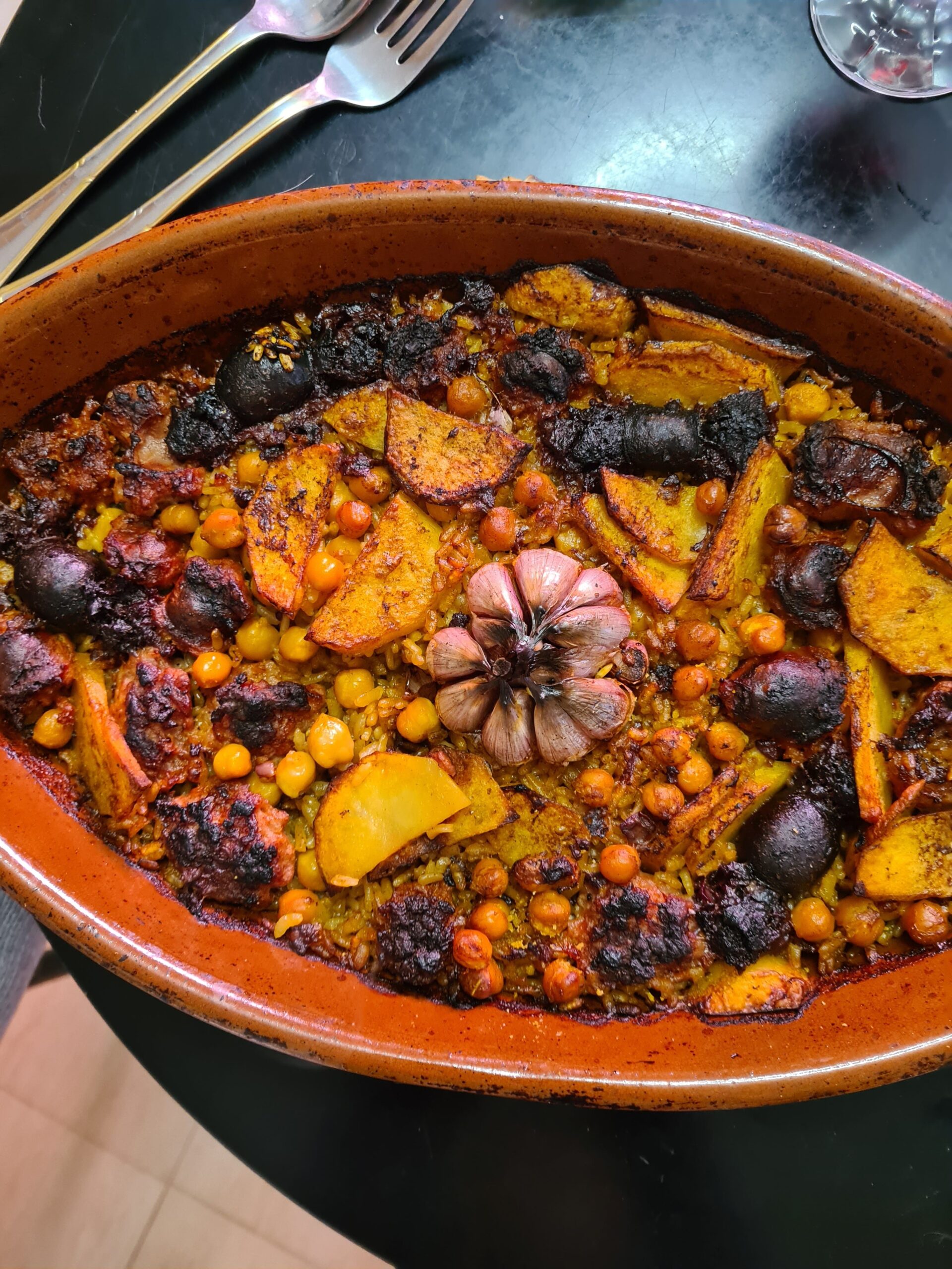 Arroz de origen valenciano que se encuentra con productos de Navarra, creando una combinación honesta y llena de sabor.