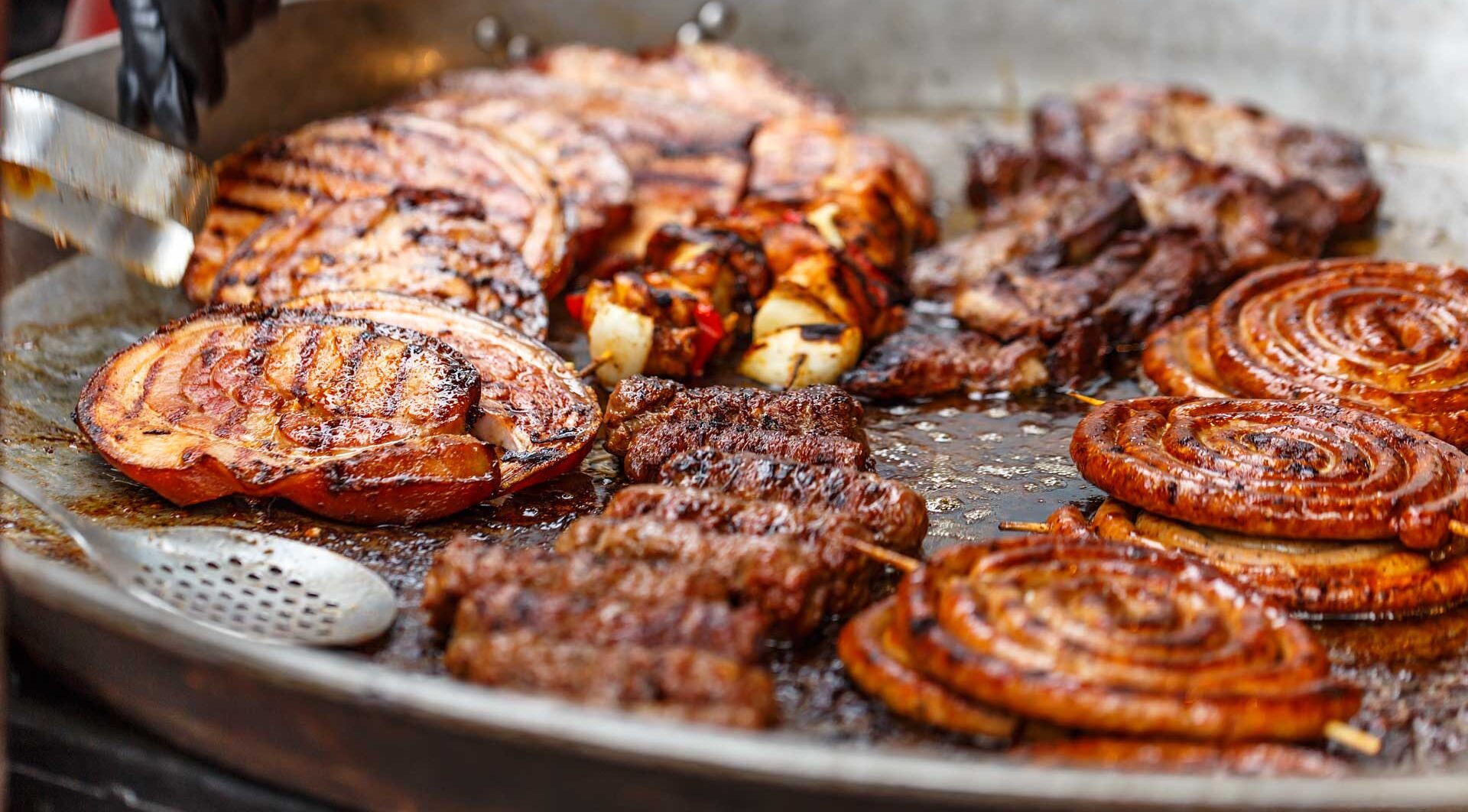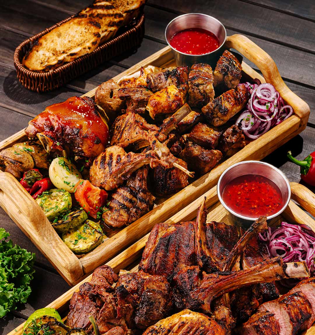 A package offering delicious selections, including a flavorful shashlik skewer for added variety. It features 5 types of BBQ meats, 6 types of salads, baguette with sauces, and full dining essentials. Priced at $19.95 per person.